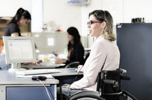 Mulher em cadeira de rodas está sentada na frente de um computador