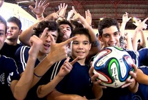Foto de algumas crianças da Escola Especial com a bola da Copa