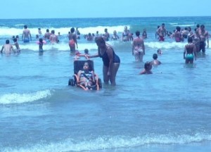Mulher está ao lado de mulher em cadeira anfíbia, dentro do mar