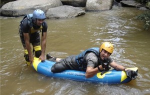 Homem com perna amputada está deitado sobre boia em cachoeira